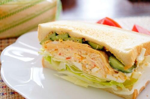 きゅうり・薄焼き卵・レタス・マスタードと コーン、かにかま、をマヨ・塩こしょう・ドライパセリを加えて混ぜ混ぜ。 どんどん、きゅうりに厚みが増してくる。。。 少しでも野菜をという、気持ちの表れかな? これは間違いなしなお味でした。